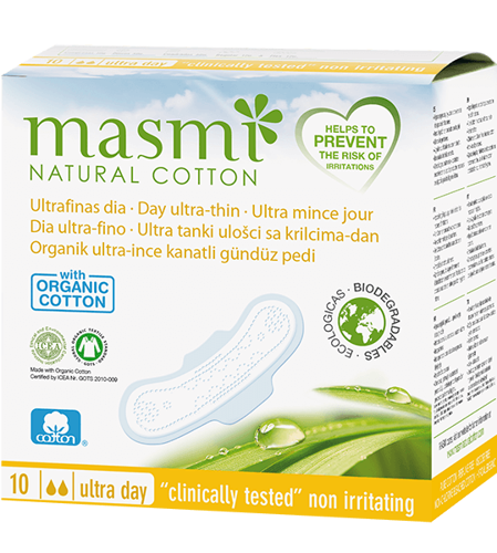 Masmi Ultra cienkie podpaski na dzień ze skrzydełkami ze 100% certyfikowanej bawełny organicznej, 10 sztuk