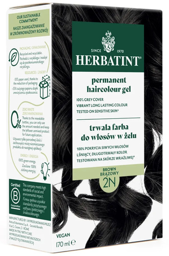 Herbatint to naturalna farba o unikalnym składzie, łagodnie i trwale farbująca włosy. Kolor 2N nazwany przez producenta "brązowym" w rzeczywistości, zależnie od rodzaju i koloru włosów, daje efekt bardzo ciemnego, głębokiego brązu, na granicy czerni. Brąz w rzeczywistości wychodzi na włosach jak kolor czarny, z brązową poświatą w słońcu. Kryje siwe włosy w 100%, niezależnie od ich ilości. Bardzo elegancki kolor!